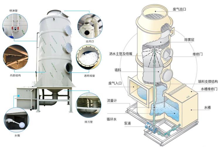 原理簡(jiǎn)述:酸堿或含塵廢氣通過(guò)風(fēng)管引入凈化塔,噴淋循環(huán)液在塔底用水泵加壓后,通過(guò)防堵塞螺旋噴頭將吸收劑形成霧氣分子,然后通過(guò)填料層后再循環(huán)到塔底。酸堿廢氣和吸收液充分接觸,發(fā)生酸堿中和反應(yīng),去除廢氣中的酸堿成分等,同時(shí)液滴還會(huì)對(duì)粉塵進(jìn)行攔截,有效去除廢氣中的顆粒物。凈化的廢氣經(jīng)除霧器除去多余的水汽,然后進(jìn)入下個(gè)處理單元進(jìn)行深度處理,終由風(fēng)機(jī)排放到大氣中。