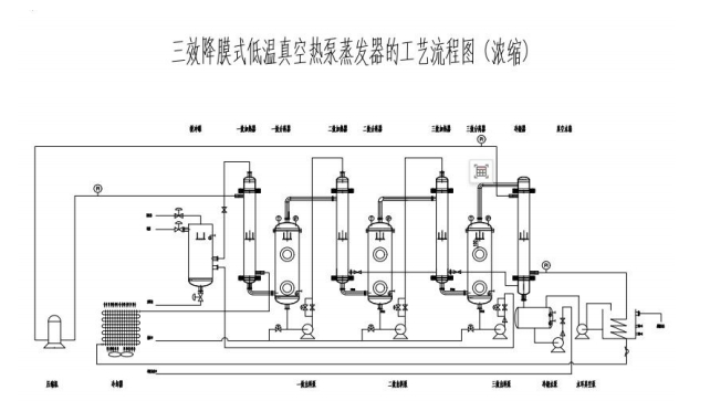 三效蒸發(fā)器是由相互串聯(lián)的三個蒸發(fā)器組成,低溫(90℃左右)加熱蒸氣被引入效,加熱其中的廢液,產(chǎn)生的蒸氣被引入第二效作為加熱蒸氣,使第二效的廢液以比效更低的溫度蒸發(fā),這個過程一直重復(fù)到一效。效凝水返回?zé)嵩刺?,其它各效凝水匯集后作為淡化水輸出,一份的蒸氣投入,可以蒸發(fā)出多倍的水出來。
